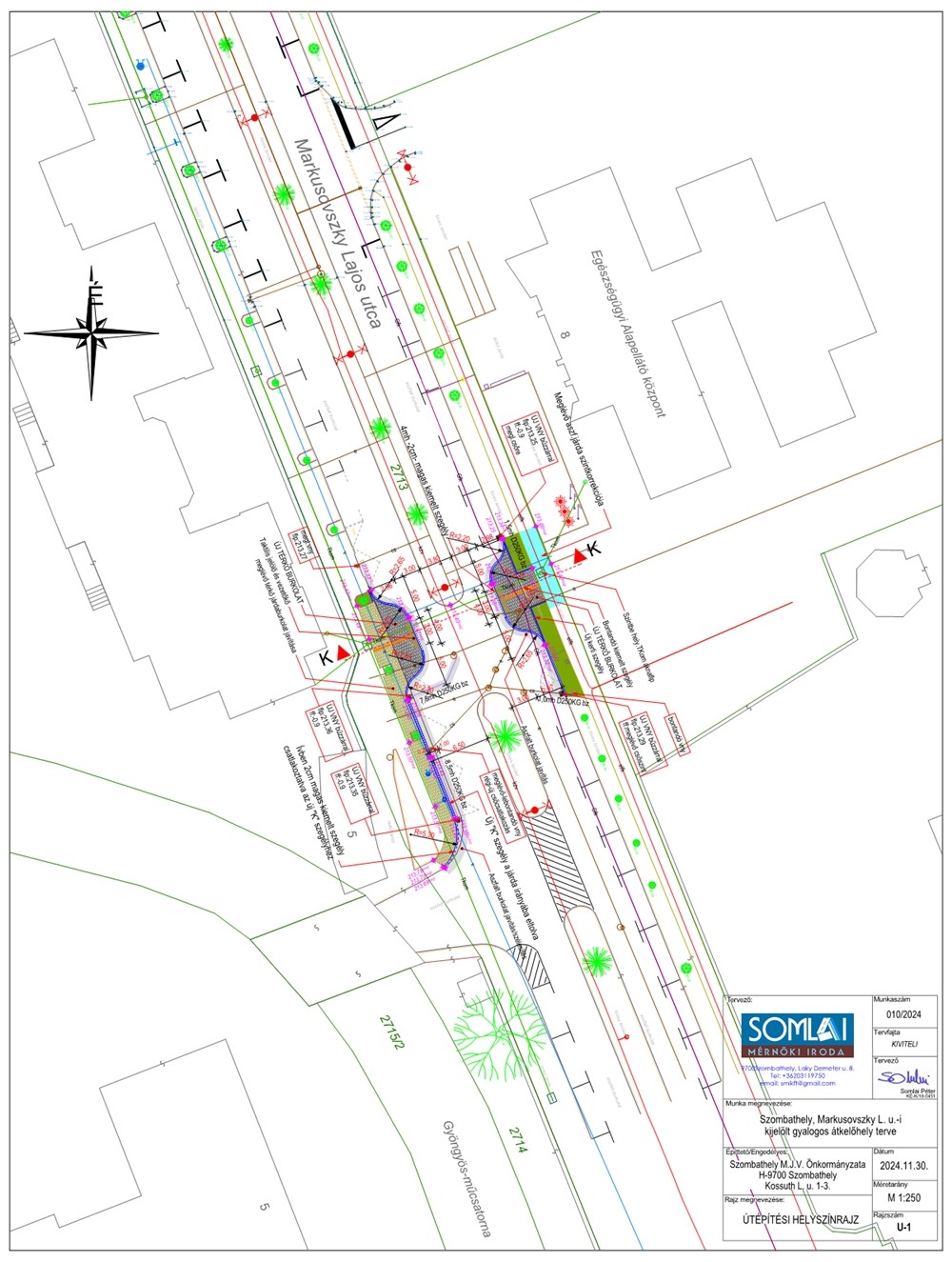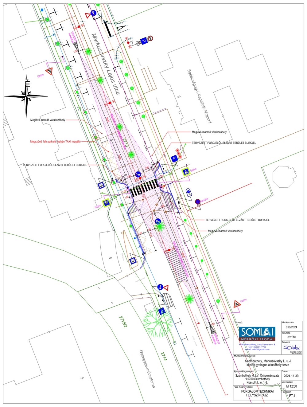 A Markusovszky utca olyan szempontból speciális, hogy a 2x1 forgalmi sáv mellett 1-1 parkolósáv is húzódik. Ezért olyan félszigeteket kell építenünk, ami a gyalogost a parkolósávon át “betolja” a forgalmi sávra. Hasonló megoldás a Jókai utcában, az POTE épületével szemben lett alkalmazva.