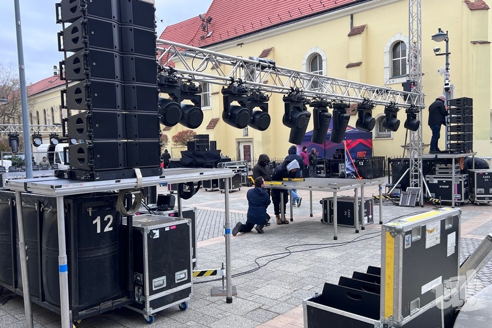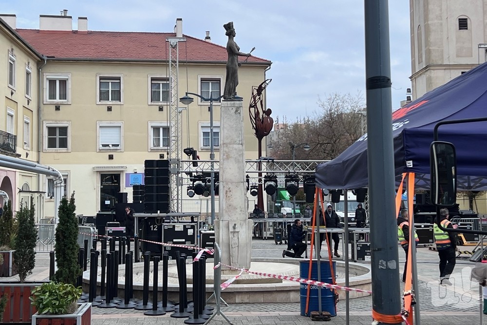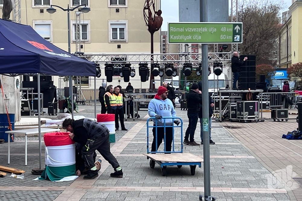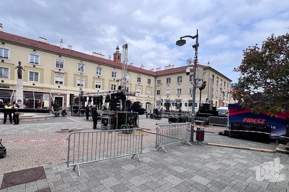 Délután fél 2 környékén már kezdte megmutatni magát a Savaria téren Orbán Viktor 19 órai beszédének helyszíne. A színpad ugyan még nem volt kész, de már látni lehetett, hogy azt a Szent Márton installáció elé, a Fő térrel szemben állítják fel.